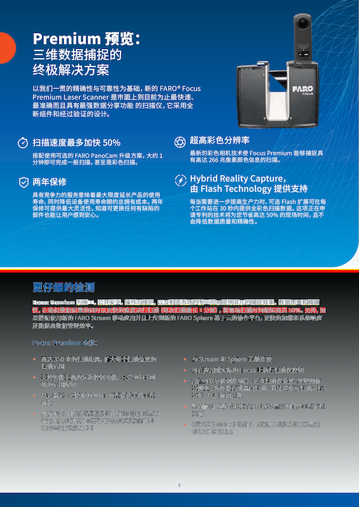 FARO FOCUS Premium 掃描儀性能介紹應(yīng)用廣泛Focus Premium 150 操作簡單,設(shè)計緊湊,完美適應(yīng)于各種應(yīng)用,包括隧道現(xiàn)場,工廠工業(yè),復(fù)雜結(jié)構(gòu)記錄,存儲罐體以及文物保護(hù)等。精確快捷Focus以200萬點(diǎn)/秒的速度構(gòu)造一個精確到毫米級的真實(shí)世界的三維數(shù)據(jù)。異常簡單Focus3D儀器本身內(nèi)置電池,操控系統(tǒng),配備直觀的觸控屏,因此可以像使用一臺數(shù)碼相機(jī)一樣簡單的操作。緊湊便攜世界目前最小,最輕便的三維激光掃描儀,重量僅為4.4kg(含電池),F(xiàn)ocus3D激光器如此小巧便攜,可以帶到任何地方Faro Focus Premium 150 激光掃描儀是用于復(fù)雜測量和建檔的高速三維掃描儀。Focus3D 采用激光技術(shù),只需數(shù)分鐘即可產(chǎn)生復(fù)雜環(huán)境和幾何結(jié)構(gòu)的詳細(xì)三維信息。利用所集成式 GPS 接收器,這款激光掃描儀能夠使每一次掃描與后處理相互關(guān)聯(lián),使其成為測量型應(yīng)用的理想選擇。可以通過實(shí)時影像框選指定的區(qū)域,進(jìn)行自定義掃描。內(nèi)置多種掃描密度供用戶選擇,用戶也可以根據(jù)實(shí)際情況,隨意設(shè)置掃描需要的掃描密度